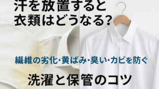 クリーニングブログ 汗を放置すると衣類に起こるダメージと防ぎ方 汗を放置すると繊維の劣化や黄ばみ、臭い、カビの原因に。素材ごとの弱点と正しい洗濯・保管方法を解説。衣類を長持ちさせるためのクリーニング活用法も紹介します。 2025.09.20 クリーニングブログ洗濯と保管のコツ洗濯コラム黄ばみ