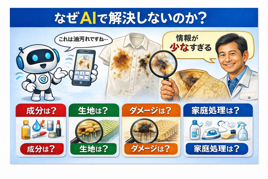 AIや検索エンジンが判断材料にするのは、あくまで「文字」や「画像」の情報です。しかし、私たちが現場で向き合っている衣類のトラブルは、もっと複雑な要素が絡み合っています。