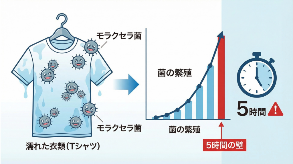 洗濯物が湿った状態で5時間以上経過すると、モラクセラ菌が爆発的に増殖し、生乾き臭の原因となります。