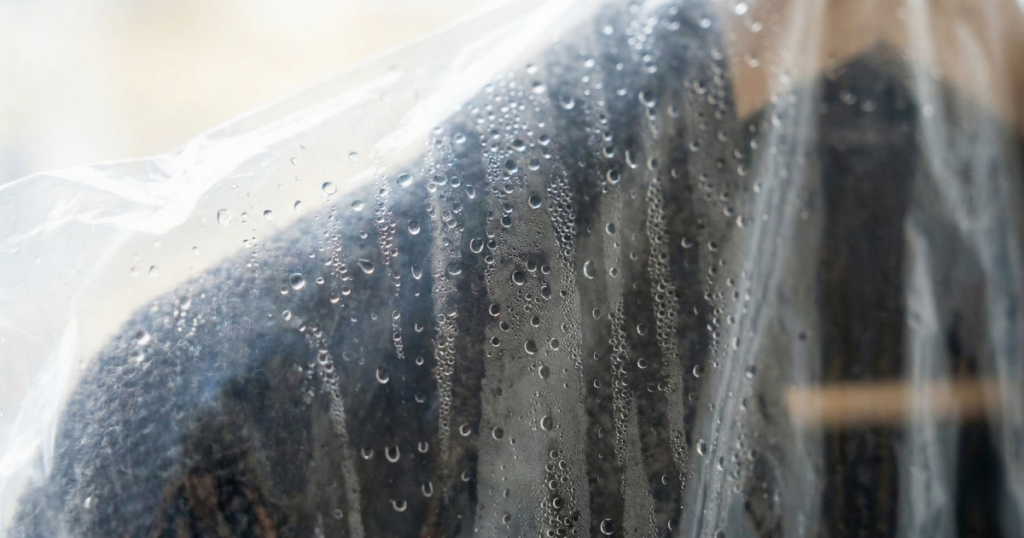 ビニールカバーは通気性がほとんどありません。上部にハンガー用の穴はありますが、空気はほとんど循環しません。クリーニング直後のお洋服には、目に見えないほどわずかな水分が残っていることがあり、それがカバーの中で「湿気」となり、カビの大好物になってしまうのです。