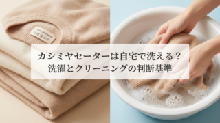 カシミヤセーターは洗濯表示を確認すれば自宅洗濯可能!水温30℃以下・中性洗剤・押し洗いが3大原則。5万円以上のハイブランドや装飾付きはクリーニング推奨。縮み・毛玉を防ぐ洗い方と、おすすめ洗剤(エマール、これだけ洗剤等)を比較表付きで解説。失敗時の復活テクニックも掲載。